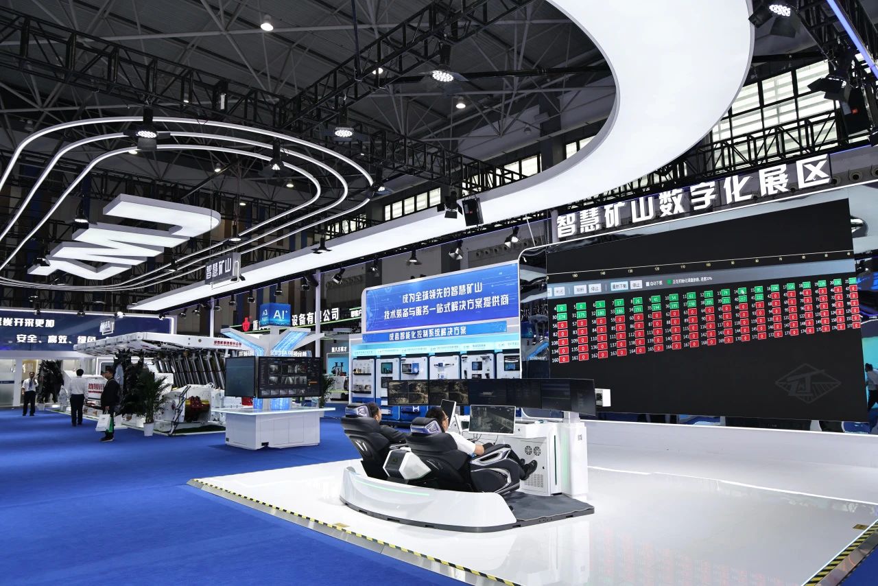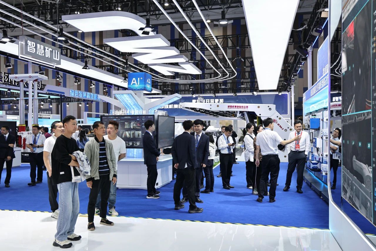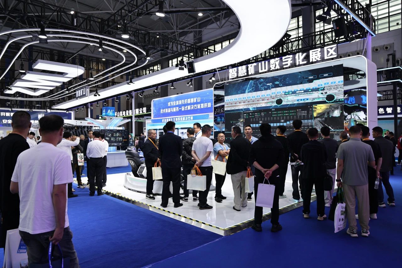 智慧矿山大屏前围满观众,高端成套装备前摩肩接踵,交流声此起彼伏,洽谈者往来不绝。