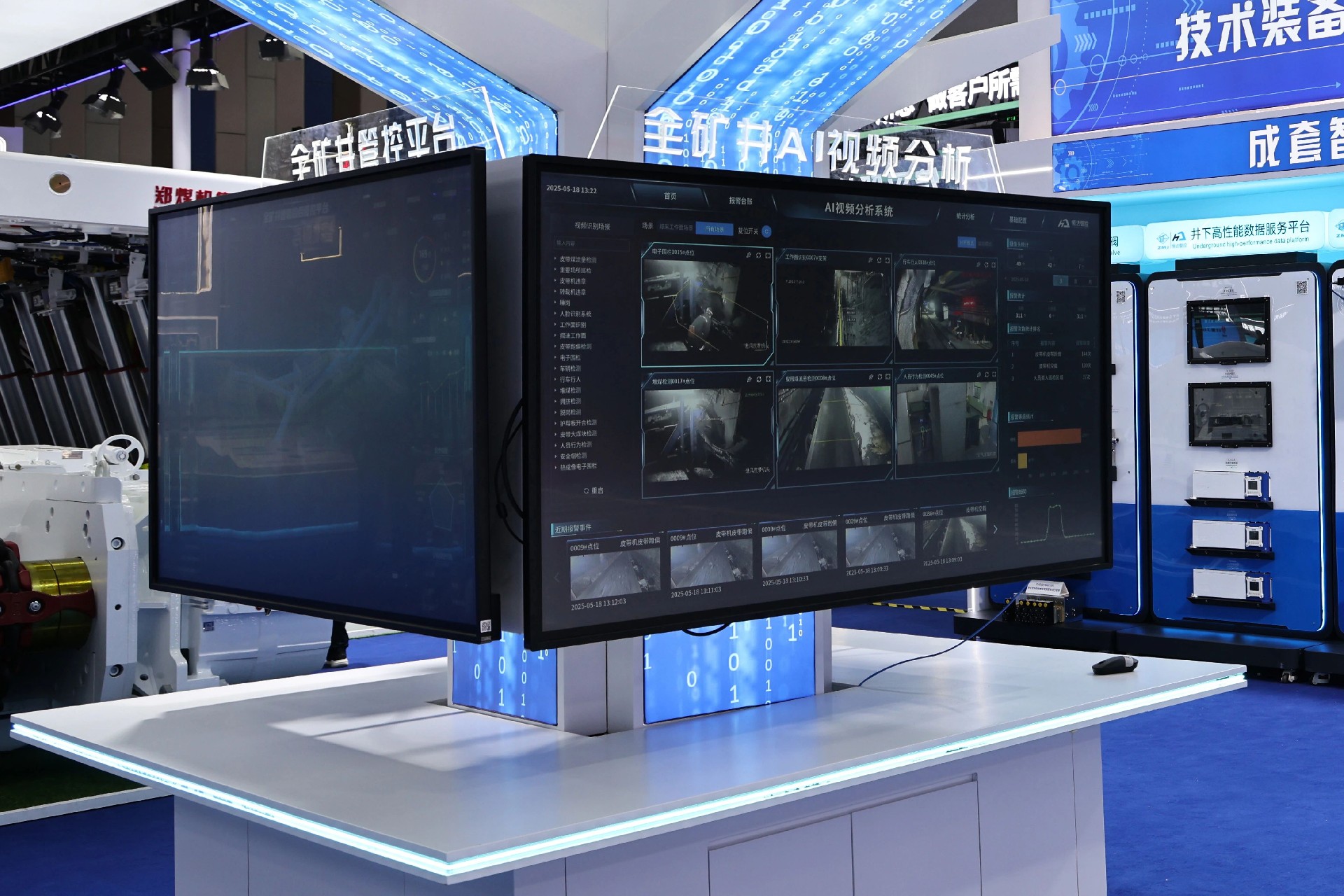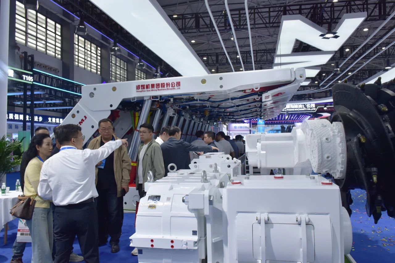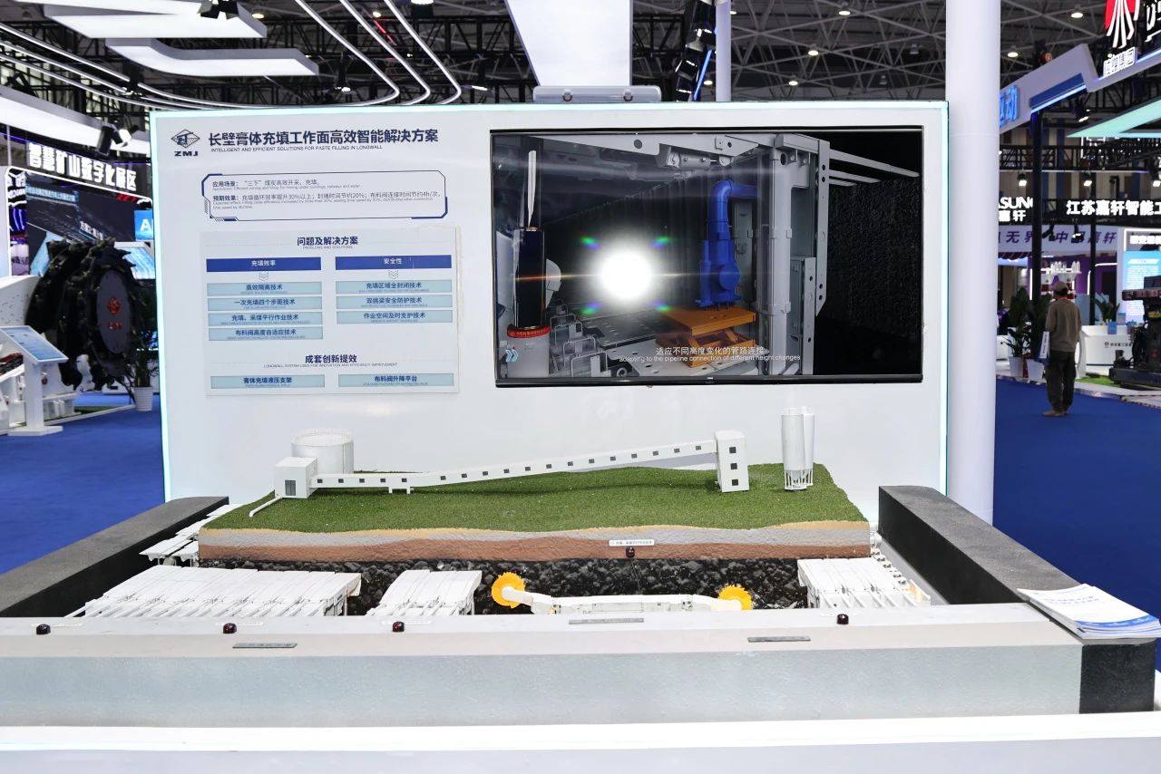 智慧矿山大屏前围满观众,高端成套装备前摩肩接踵,交流声此起彼伏,洽谈者往来不绝。