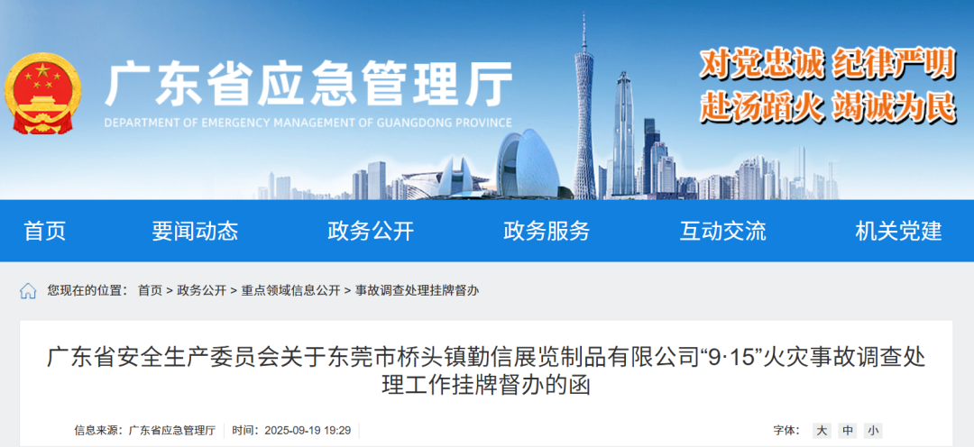 近日,广东省应急管理厅发布《广东省安全生产委员会关于东莞市桥头镇勤信展览制品有限公司“9·15”火灾事故调查处理工作挂牌督办的函》显示,9月15日,位于广东东莞市桥头镇朗厦村的东莞市勤信展览制品有限公司发生火灾,造成2人死亡。...