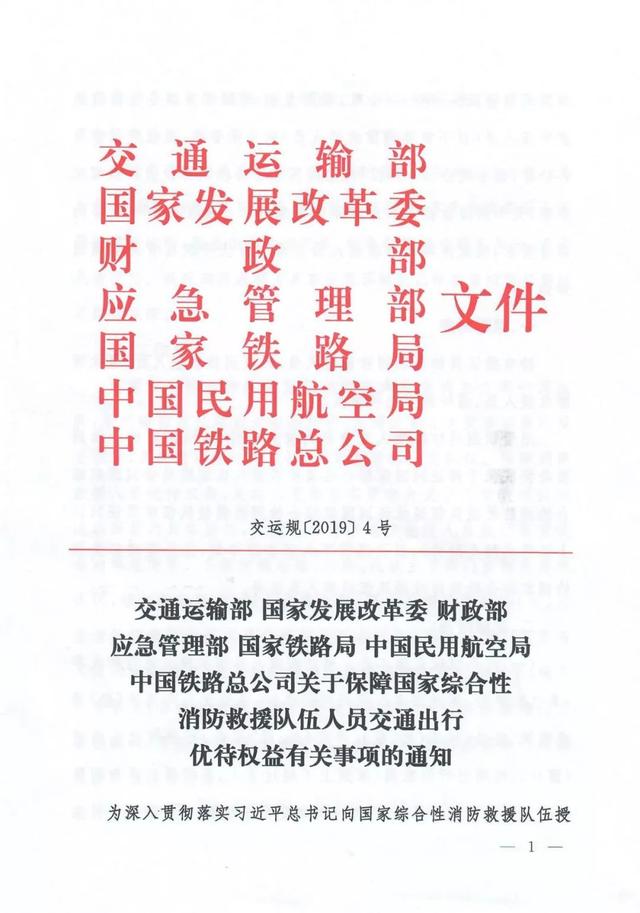 5月13日,交通运输部、国家发展改革委、财政部、应急管理部、国家铁路局、中国民用航空局、中国铁路总公司印发了《关于保障国家综合性消防救援队伍人员交通出行优待权益有关事项的通知》。