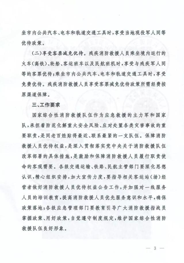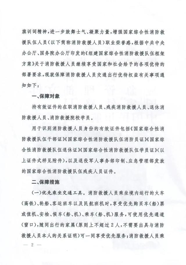 其中,明确了在职消防救援人员、残疾消防救援人员、退(离)休消防救援人员、消防救援院校学员乘坐境内运行的火车(高铁)、轮船、客运班车以及民航班机时,享受优先购票、安检、候车(船、机)、乘车(船、机),可使用优先通道(窗口),随同出行的家属(原则上不超过2人,不需要出具与消防救援人员本人的关系证明)可一同享受优先服务;乘坐市内公共汽车、电车和轨道交通工具时,享受当地现役军人同等优待政策。