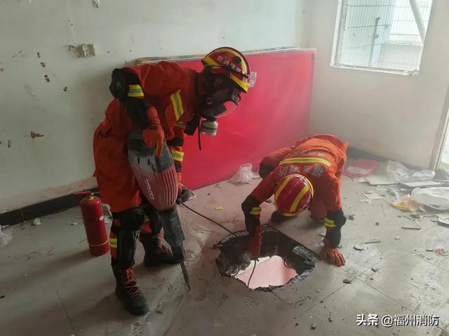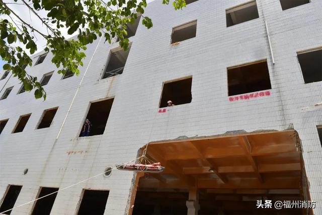 ▲演练模拟一名女子,胸口遭尖锐物体扎伤,血流不止,处于昏迷状态,被困于楼层内。此项目主要考核救援人员的定位、破拆急救能力。