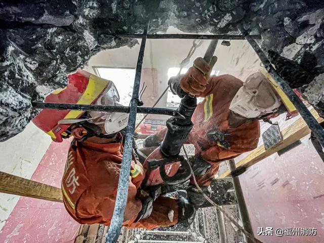 使用木方对倒塌楼板进行稳固支撑,并利用凿岩机对二楼顶部楼板进行安全破拆。